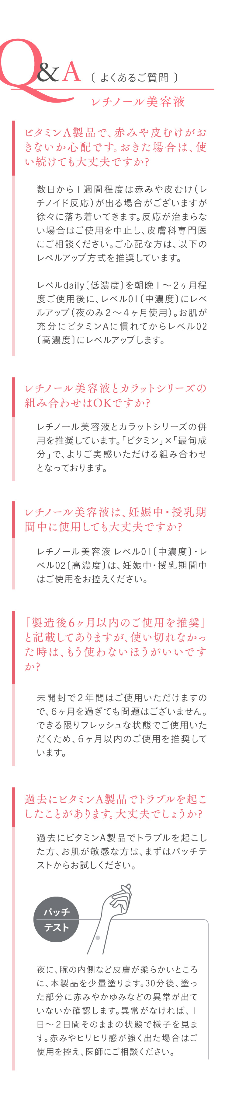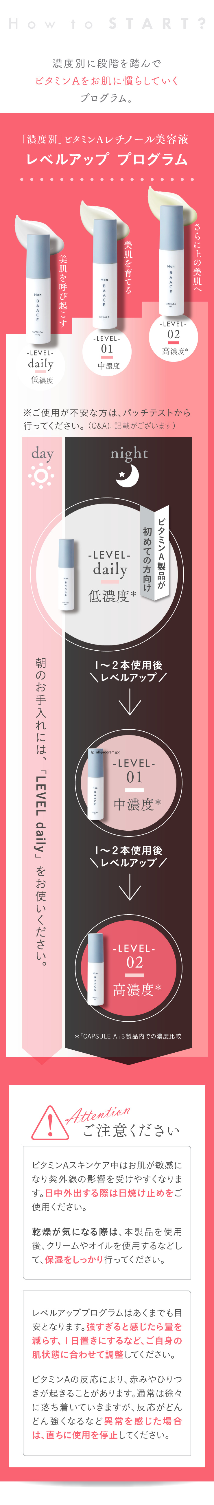| ご使用方法 | 夜のスキンケアとして化粧水等でお肌を整えた後、ディスペンサー2~3プッシュを目安に適量を手に取り、目の周りを避け顔全体になじませてください。 ※朝のご使用はお控えください。(朝のお手入れにはLEVEL-dailyをお使いください) ※刺激が強いと感じたら量を減らす・1日おきにするなど、ご自身の肌状態に合わせて調整してください。 |