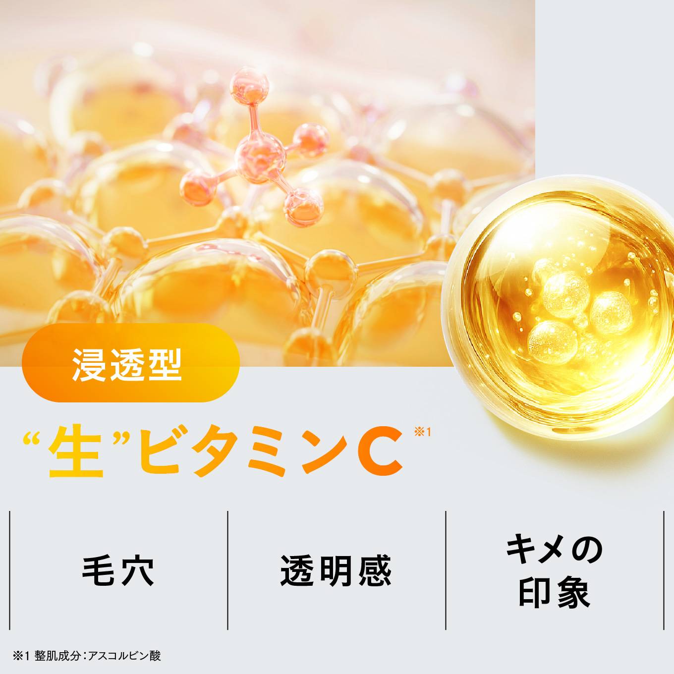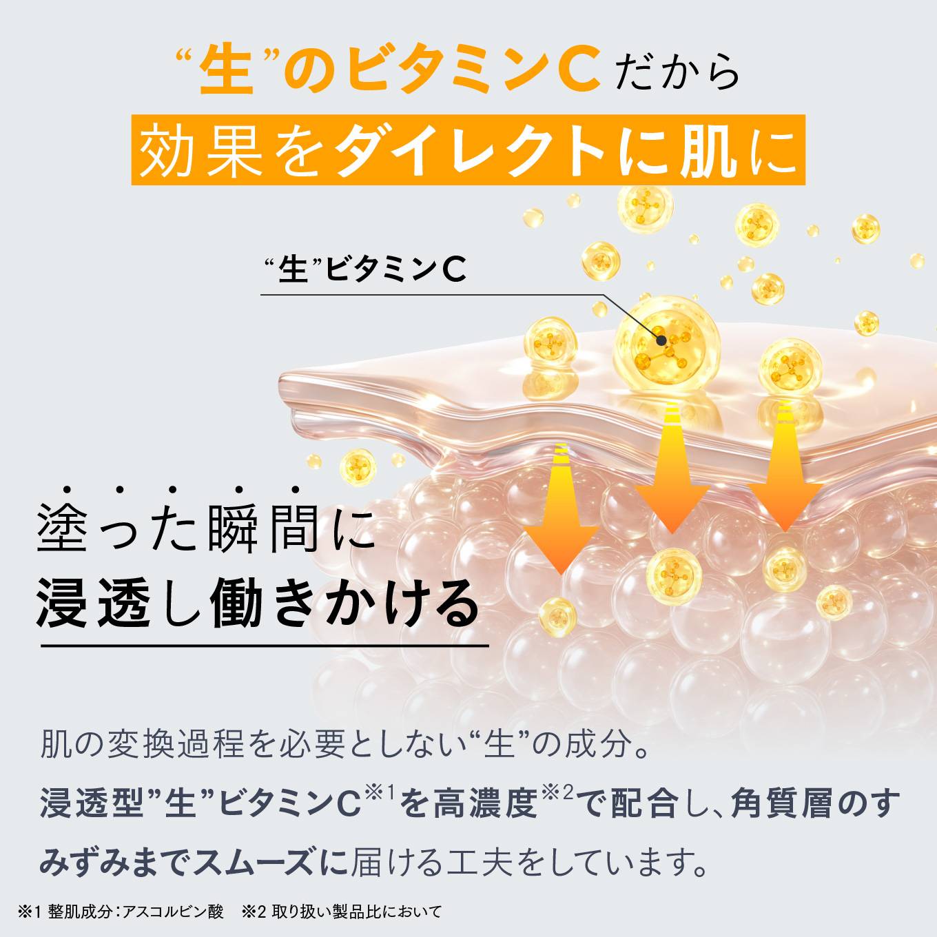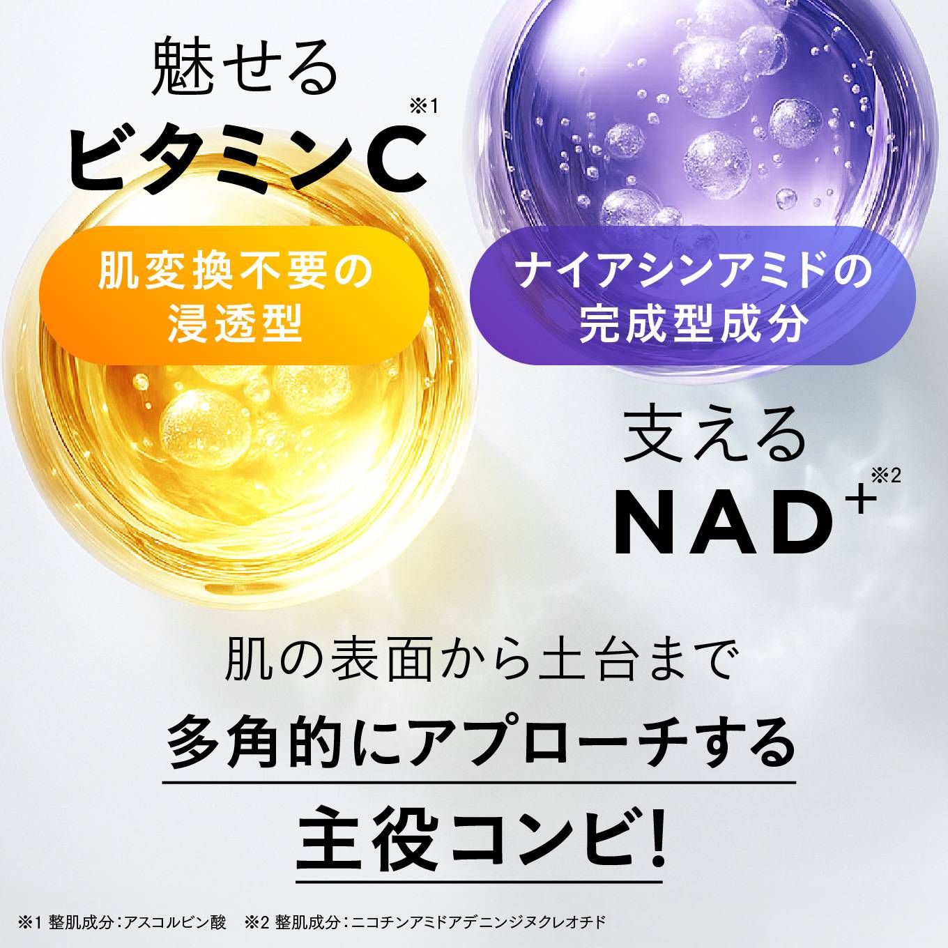 | パキッと折っていつでも新鮮!! いつでも新鮮にお使いいただけるよう、「ピュアビタミンC※1」や「NAD⁺※2」などの注目成分を贅沢に配合した美容液を、フレッシュなままパウチに密封しました。 ※1 整肌成分:アスコルビン酸 ※2 整肌成分:ニコチンアミドアデニンジヌクレオチド |